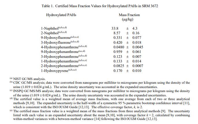 NIST SRM 3672 吸煙者尿液中有機污染物表 1 中提供了羥基化 PAH 的認證質量分數值。 NIST 認證值是 NIST 對其準確性具有最高置信度的值,因為所有已知或可疑的不確定性來源都已被調查或考慮在內帳戶 [1]。認證值基于 NIST、CDC 和魁北克國家公共衛生研究所 (INSPQ) 獲得的結果一致。