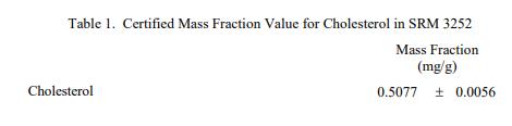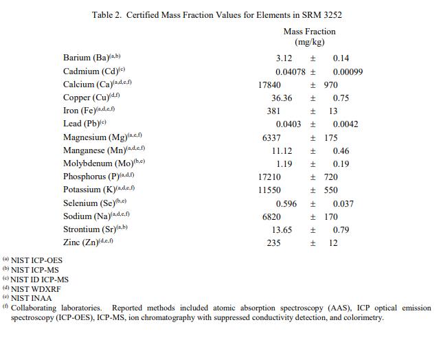 表 1 至表 3 中提供了NIST SRM 3252蛋白質(zhì)飲料混合物中膽固醇、元素和維生素的認證質(zhì)量分數(shù)值,以干質(zhì)量為基礎報告。NIST 認證值是 NIST 認證的值對其準確性的信心最高,因為所有已知或可疑的偏差和可變性來源都已考慮在內(nèi) [1]。價值分配分析由 NIST 和合作實驗室進行。認證值計算為 NIST 方法的平均值和合作實驗室提供的平均結(jié)果的中位數(shù)(在適當?shù)那闆r下)。相關的不確定性以大約 95% 的置信水平表示 [2-4]。