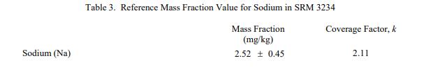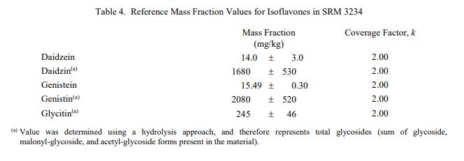 表 3 到表 6 提供了NIST SRM 3234豆粉(標準品) 中鈉、異黃酮、近似物、總膳食纖維、卡路里和氨基酸的參考質量分數(shù)值,以干質量為基礎報告。NIST 參考值是未經認證的值,它是基于可用數(shù)據對真實值的最佳估計;但是,該值不符合 NIST 認證標準 [1],并且提供的不確定度可能僅反映測量再現(xiàn)性,可能不包括所有不確定性來源,或者可能反映多種分析方法之間缺乏足夠的統(tǒng)計一致性。參考質量分數(shù)值來自 NIST 或合作實驗室報告的結果。