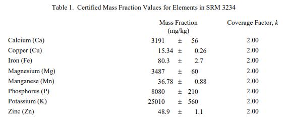 表 1 和表 2 提供了NIST SRM 3234豆粉(標準品) 中元素和維生素的認證質量分數(shù)值,以干質量為基礎報告。NIST 認證值是 NIST 對其準確性有最高置信度的值因為所有已知或可疑的偏見來源都已被調查或考慮 [1]。價值分配分析由 NIST 和合作實驗室進行。認證值計算為 NIST 方法的平均值和合作實驗室提供的平均結果的中位數(shù)(在適當?shù)那闆r下)。所有值在沒有加權的情況下合并。相關的不確定性以大約 95% 的置信水平表示 [2-4]。
