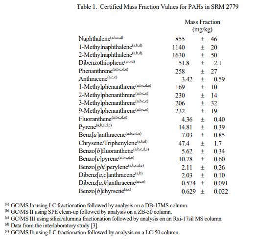表 1 中提供了 21 種 PAH 的認(rèn)證質(zhì)量分?jǐn)?shù)值。NIST 認(rèn)證值是 NIST 對(duì)其準(zhǔn)確性有最高置信度的值,因?yàn)樗幸阎蚩梢傻钠顏碓炊家驯徽{(diào)查或考慮在內(nèi)帳戶 [1]。認(rèn)證值基于以下協(xié)議在 NIST 使用多種分析技術(shù)獲得的結(jié)果。