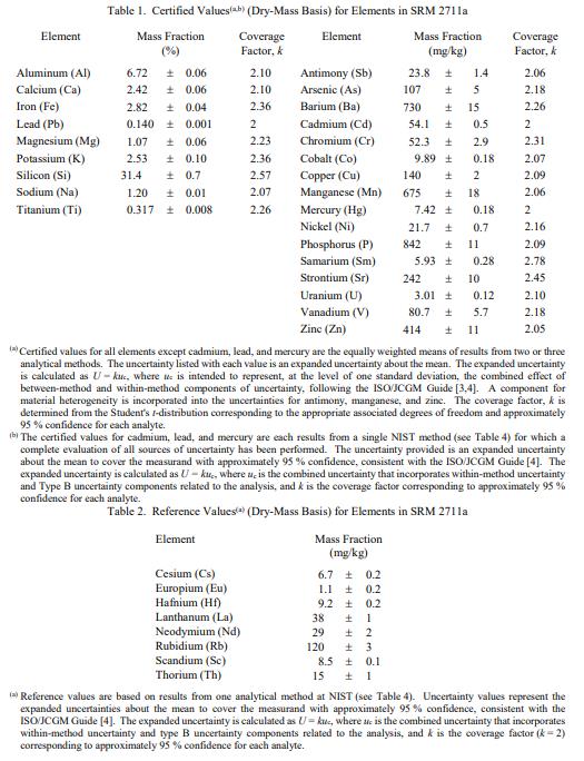 表 1 中提供了元素的認(rèn)證濃度,以基于干質(zhì)量的質(zhì)量分?jǐn)?shù) [1] 表示。認(rèn)證值基于通過嚴(yán)格評估的獨立分析技術(shù)獲得的結(jié)果。 NIST 認(rèn)證值是 NIST 對其準(zhǔn)確性具有最高置信度的值,因為所有已知或可疑的偏差來源都已被調(diào)查或考慮在內(nèi) [2]。被測量是表 1 中報告的元素的總濃度。計量溯源性為 SI 質(zhì)量單位,表示為導(dǎo)出的質(zhì)量分?jǐn)?shù)單位。
