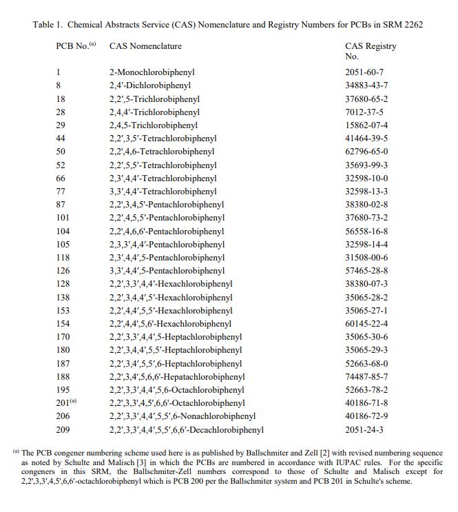 NIST SRM 2262 2,2,4-三甲基戊烷PCB同系物(標(biāo)準(zhǔn)品)是 28 種氯化聯(lián)苯同系物(也稱為多氯聯(lián)苯 (PCB) 同系物)在 2,2,4-三甲基戊烷(異辛烷)中的溶液。表 1 中列出了每種成分的化學(xué)文摘社 (CAS) 命名法和登記號。此 SRM 主要用于校準(zhǔn)色譜儀器,用于確定經(jīng)認證的化合物。一個 SRM 2262 單元由五個 2 mL 安瓿組成,每個安瓿含有大約 1.2 mL 溶液。
