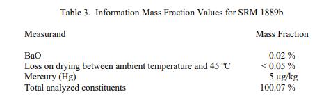 表 3 中報告了成分的信息值、環(huán)境溫度和 45 oC 之間的 LOI 以及總分析成分的信息值。信息值被認為是 SRM 用戶可能感興趣的值,但沒有足夠的信息來評估與值相關(guān)的不確定性 [2]。信息值不能用于建立計量溯源性。