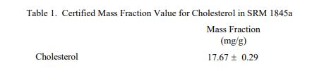 表 1 至表 3 提供了 SRM 1845a 中膽固醇、元素和維生素的認(rèn)證質(zhì)量分?jǐn)?shù)值,按原樣報(bào)告,在表 1 至 3 中提供。NIST 認(rèn)證值是 NIST 具有最高置信度的值其準(zhǔn)確性在于所有已知或可疑的偏差和可變性來(lái)源已考慮[1]。價(jià)值分配分析由 NIST 和合作實(shí)驗(yàn)室進(jìn)行。認(rèn)證值計(jì)算為 NIST 方法的平均值和合作實(shí)驗(yàn)室提供的結(jié)果平均值的中位數(shù)或平均值(如果適用)。相關(guān)的不確定性以大約 95% 的置信水平表示 [2-4]。