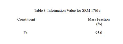 表 1 報告了 SRM 1761a 的 14 種成分的認證值。表 2 報告了七種成分的參考值。表 3 報告了 Fe 的信息值。對于所有元素,值都以質量分數報告 [1]。賦值類別基于 NIST 用于化學參考材料 [2] 的術語和模式的定義。