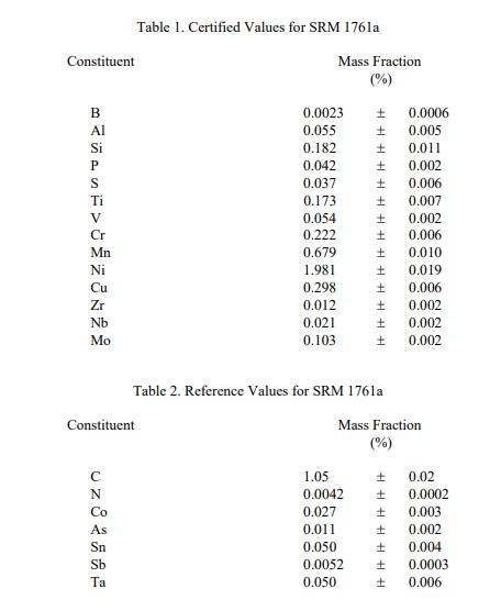SRM 1761a 的值分配基于此 SRM 與原始 SRM 1761 的完整、高精度比較。SRM 1761a 的材料被證明與所有元素的原始材料沒有區別,除了 C、N 和 V . SRM 1761a 的賦值被認為可以直接追溯到用于 SRM 1761 賦值的主要參考物質和校準。C 和 N 的賦值是使用基于 SRM 1761 的校準通過燃燒和紅外檢測獲得的。V 的賦值是通過 X 射線熒光光譜法獲得的基于低合金鋼 SRM 1761 至 1768 的校準。在此證書中列出了賦值中采用的測試方法。