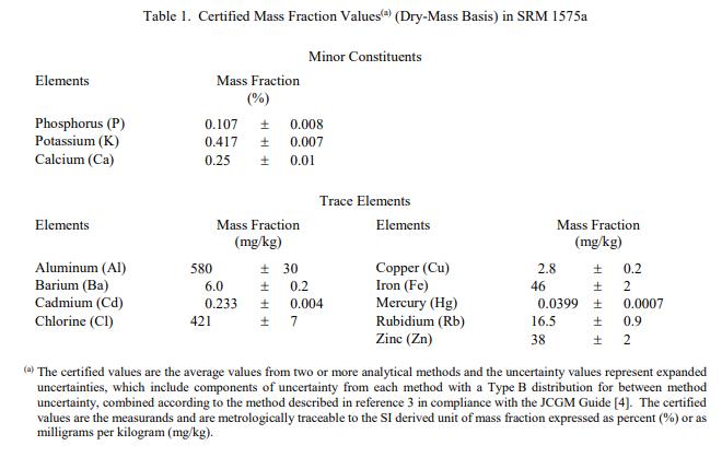 表 2 中提供了十一種成分的參考值,以基于干質(zhì)量的質(zhì)量分?jǐn)?shù)表示。參考值基于從單一 NIST 分析方法獲得的結(jié)果。參考值是未經(jīng)認(rèn)證的值,是對(duì)真實(shí)值的估計(jì)。但是,這些值不符合 NIST 認(rèn)證標(biāo)準(zhǔn),并且提供了相關(guān)的不確定性,可能不包括所有不確定性來源 [2]。信息值:表 3 中提供了兩個(gè)元素的信息值。信息值是一個(gè)值SRM 用戶可能感興趣,但沒有足夠的信息來評(píng)估與值相關(guān)的不確定性 [2]。信息值不能用于建立計(jì)量溯源性。